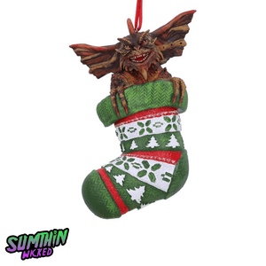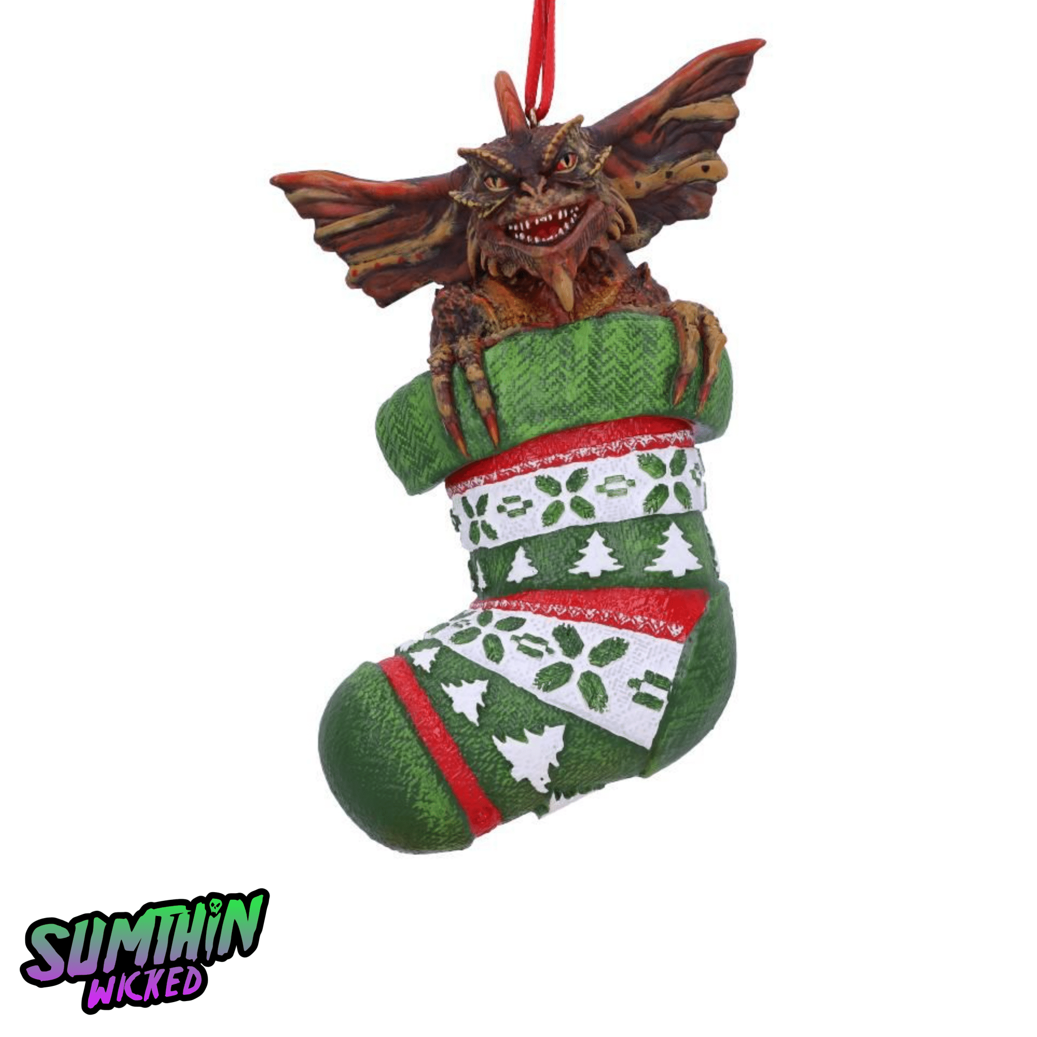 Here we see a mischievous Gremlin hanging in an ornate stocking, ready to cause havoc in its new home!